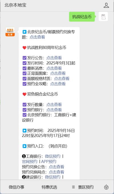 温馨提示:微信搜索公众号【北京本地宝】,关注后在聊天对话框回复【抗战纪念币】获取2025抗战胜利80周年普通纪念币各银行预约入口、预约时间几点、发行量、兑换时间安排、兑换限额、预约证件要求、纪念币图案、公众防伪特征;金银纪念币销售规则、销售渠道等信息。